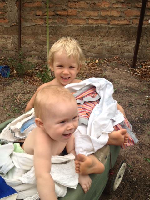 Zane and Addison helping me collect clothes before it rains. We just barely made it!